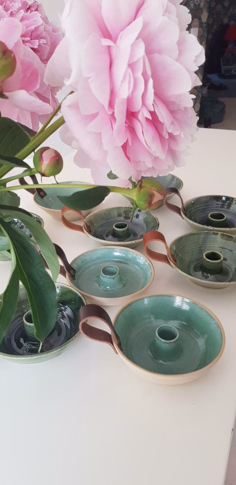 Grön ljusstake med läderrem